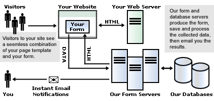 - Upon designing the form, you place a snippet of <HTML> code into the page where you would like to display the form. This snippet of code outputs the form from our form servers.